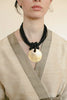 A sculptural necklace crafted from multiple strands of black waxed cotton ribbon. The decoration is made with mother of pearls and onyx beads.